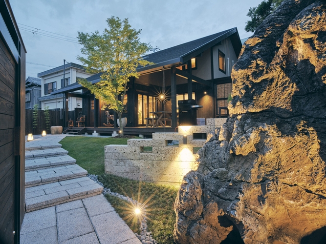 24時間貸切の岩屋温泉、キッチンとリビングが自由に使える2階建ての空間。敷地面積594平米、ダブルス用テニスコート約2.3面分に相当する、ゆとりあるプライベート空間です。