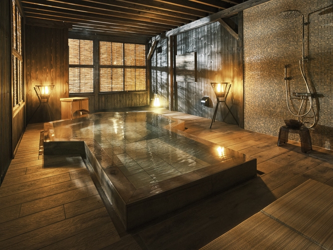 宿には岩屋温泉(単純弱ラドン温泉・昭和46年開湯)の内湯と露天風呂が備わり、チェックインからチェックアウトまで24時間いつでも貸切でお使いいただけます。