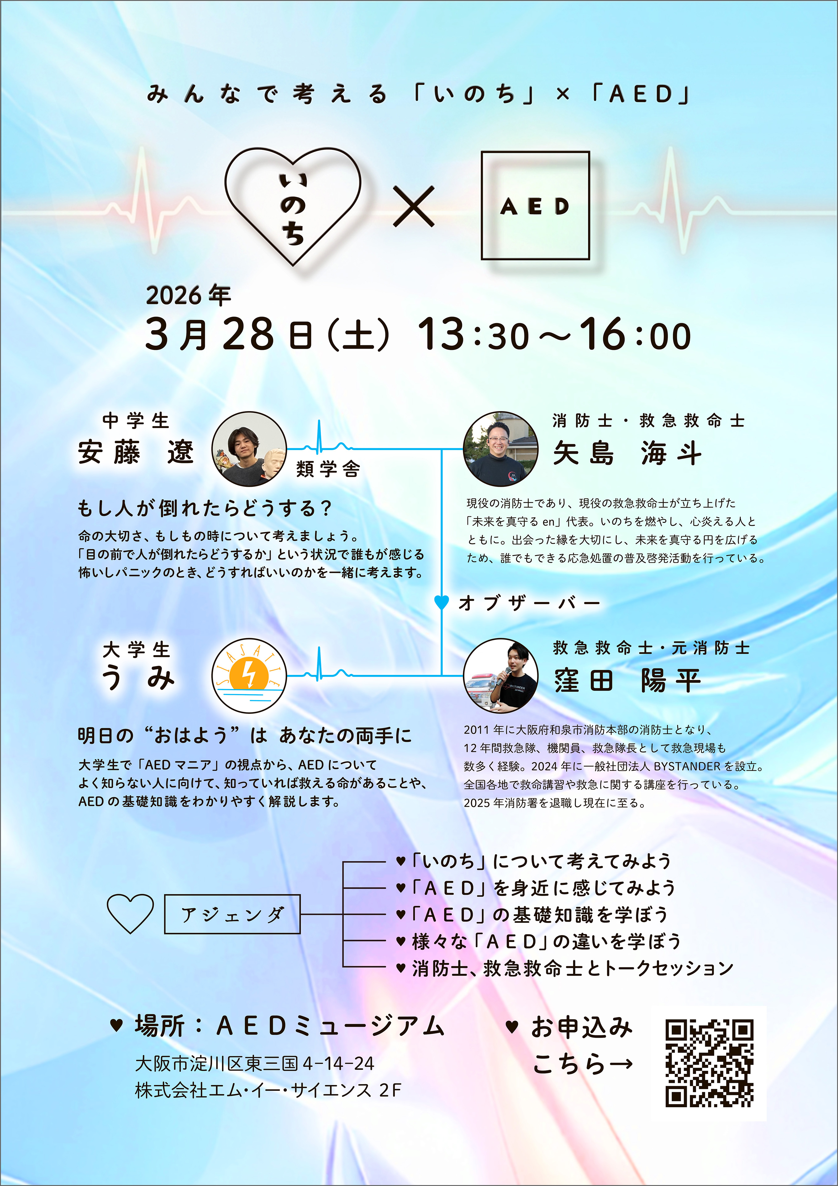 弊社の類学舎に通う安藤遼(15、あんどうはる)君が3月28日(土)、大阪・淀川区東三国にあるAEDミュージュアム(AED歴史博物館)主催のイベント「みんなで考える『いのち』×『AED』」に登だんします。
