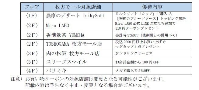 ・枚方モール:お買い物クーポン(5枚)