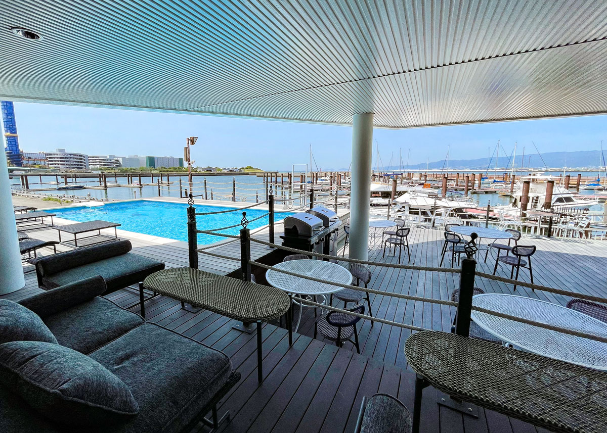 海とプールに囲まれたウッドデッキテラス。ヨットが行き交う景色を眺めながら過ごす時間は、まるで海外リゾート。2名様から予約可能で、夜はライトアップされたプールサイドでのデートにも最適です。(別途施設利用料 1,000円/人)