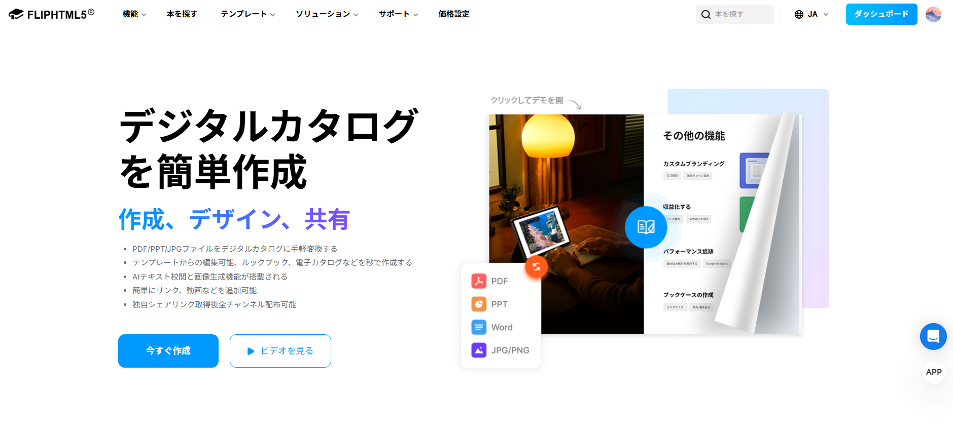 FlipHTML5は、PDF、Word、PowerPointなどのファイルを、魅力的なデジタルカタログへ変換できるオンラインサービスを提供しています。従来の制作代行会社とは異なり、ユーザー自身による自由度の高い制作環境を重視するとともに、コンテンツ編集においても充実したサポート機能を備えている点が特長です。