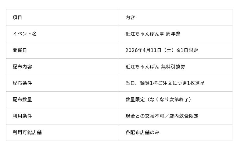 ― 日頃のご愛顧に感謝を込めて、1日限定で近江ちゃんぽん無料引換券を進呈 ―