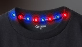 150ミリテスラの磁石8個を独自のN極S極交互配列で配置したシリコン紐を襟テープ部に装着。装着部の血行を改善、筋肉のコリを緩和します。