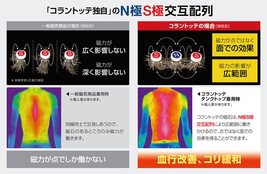 ・コラントッテの磁石は独自のN極S極交互配列により磁気を広範囲に働きかけることができるので、「点ではなく面で」の効果を得ることができます。この効果により磁気が血行改善・筋肉のコリを緩和し、回復を促します。