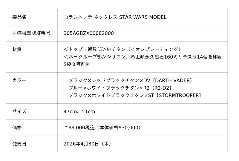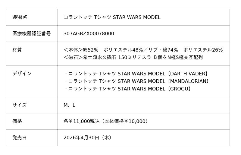磁気健康ギア「Colantotte(コラントッテ)」の製造・販売元である株式会社コラントッテ(本社:大阪市中央区、代表取締役社長:小松 克已)は、「コラントッテ ネックレス STAR WARS MODEL」「コラントッテ Tシャツ STAR WARS MODEL」を2026年4月30 日(木)より公式オンラインストア、直営店、一部取り扱い店舗で数量限定販売いたします。