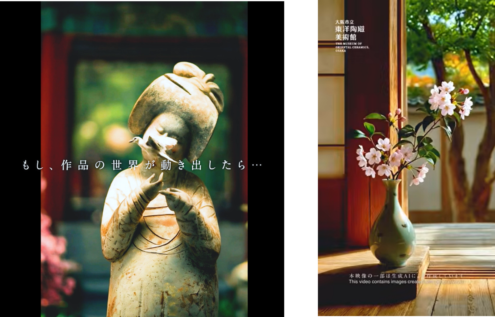 本動画は、約50秒の作品紹介と約10秒のAI映像で構成されています。作品の形や装飾、見どころを紹介した後、器に描かれたモチーフが動き出すなど、作品の世界観を広げる映像表現を取り入れています。例えば、花器の周囲の季節が移ろう映像や、壺に描かれた鳥の文様が実をついばみ飛び立つ場面、鯉の文様がゆったりと泳ぎだす様子など、それぞれの作品に合わせた演出で制作しています。