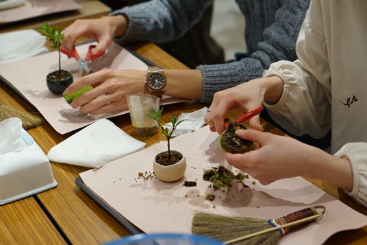 さまざまなカラーの鉢と受け皿、そして個性豊かな樹木の中からお好きなものをお選びいただき、自分だけのオリジナル盆栽を制作するワークショップです。季節感を感じる樹木を中心にご用意しています。