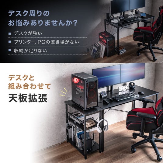 底板には補強パイプを追加し、耐荷重30kgを確保しています。重量のあるゲーミングPCや大型機器を足元に置きたい場合にも安心です。天板は15kg、棚板は10kgまで対応し、総耐荷重は55kg。パソコン周辺機器をまとめて収納したい方や、デスク下・デスク横を有効活用したい方に頼れる一台です。