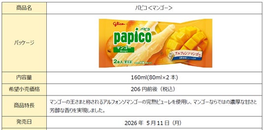 江崎グリコ株式会社は、2026 年 5 月11日(月)より「パピコ<マンゴー>」を全国で新発売します。マンゴーの王さまと称される完熟アルフォンソマンゴーピューレを使用し、マンゴーならではの濃厚な甘さや芳醇な香り、なめらかな食感が特長です。