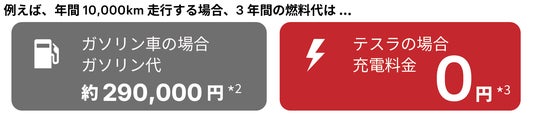 この特典は、テスラの急速充電ネットワークを活用したテスラの利便性を最大限に活用したキャンペーンとなり、この期間にテスラを購入、納車された方は、ガソリン車との燃料費比較で数十万円相当の節約効果が見込まれます。また、3年間は燃料代が不要という経済的メリットを上回る安心感がセットになったテスラならではなユニークな取り組みです。